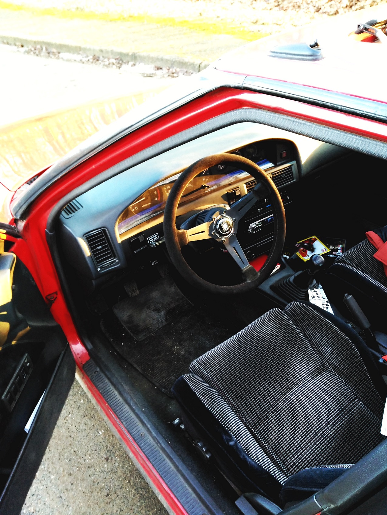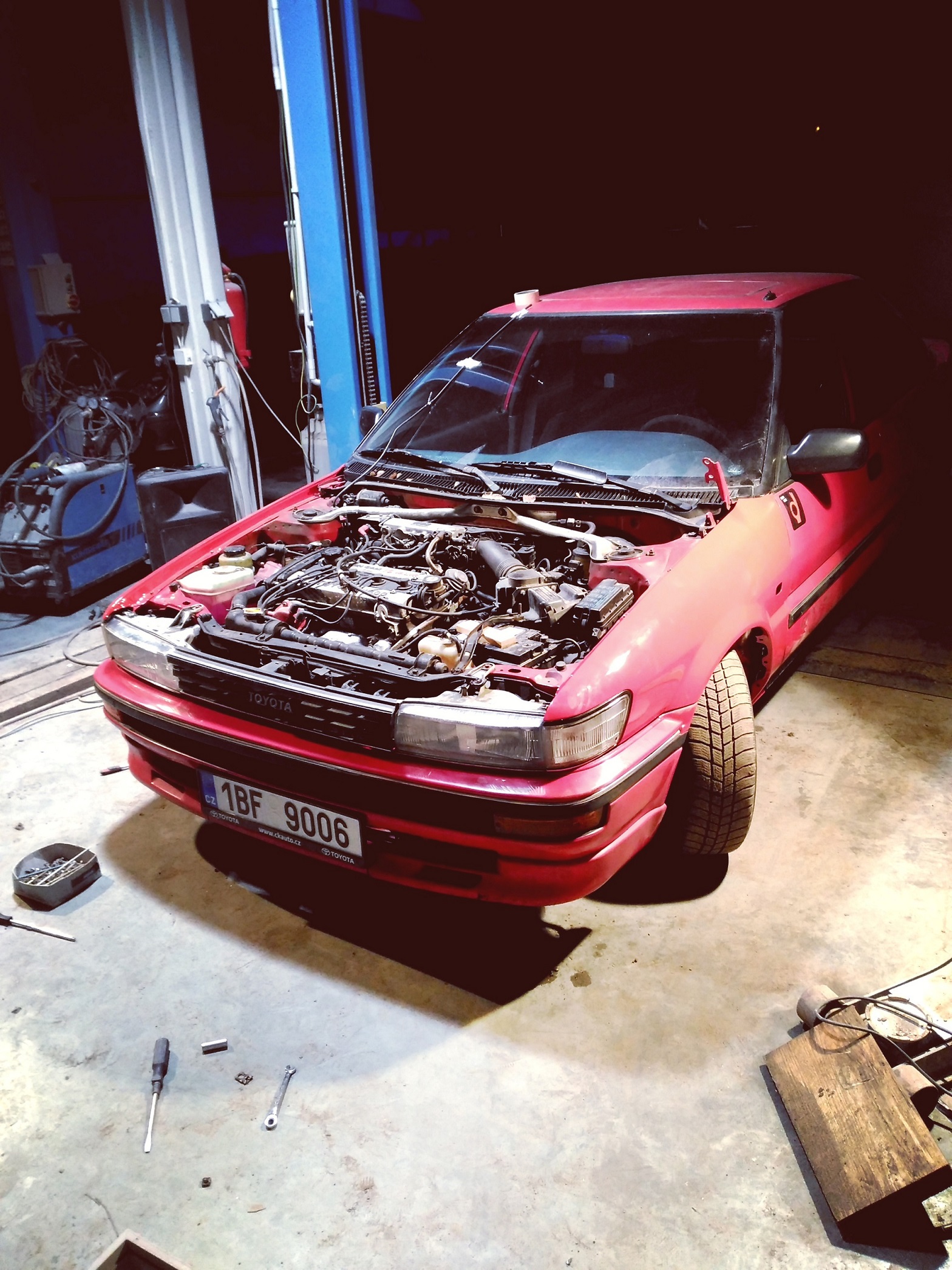 Následovala projížďka a zkoušení co funguje a co je už mrtvý. Kupodivu fungovalo skoro vše, na 27 let starý auto je to slušný, ale taky se není čemu divit, je to ještě poctivá japonská výroba! A dále následovalo odstranění "blbostí" předchozího majitele, jako byl: držák na telefon, nálepka CZ a odrazky na dveřích. Měnil sem provozní kapaliny a všechny filtry. Dále bylo potřeba vyměnit termostat, díky kterýmu se motor dostatečně neohříval, a taky sem několikrát vytahoval alternátor, čistil ho a měnil uhlíky. A věřte že pro člověka jako jsem já, kterej je absolutní antitalent co se týče mechaniky a živí se obracením steaků a mícháním omáček, to fakt sranda nebyla