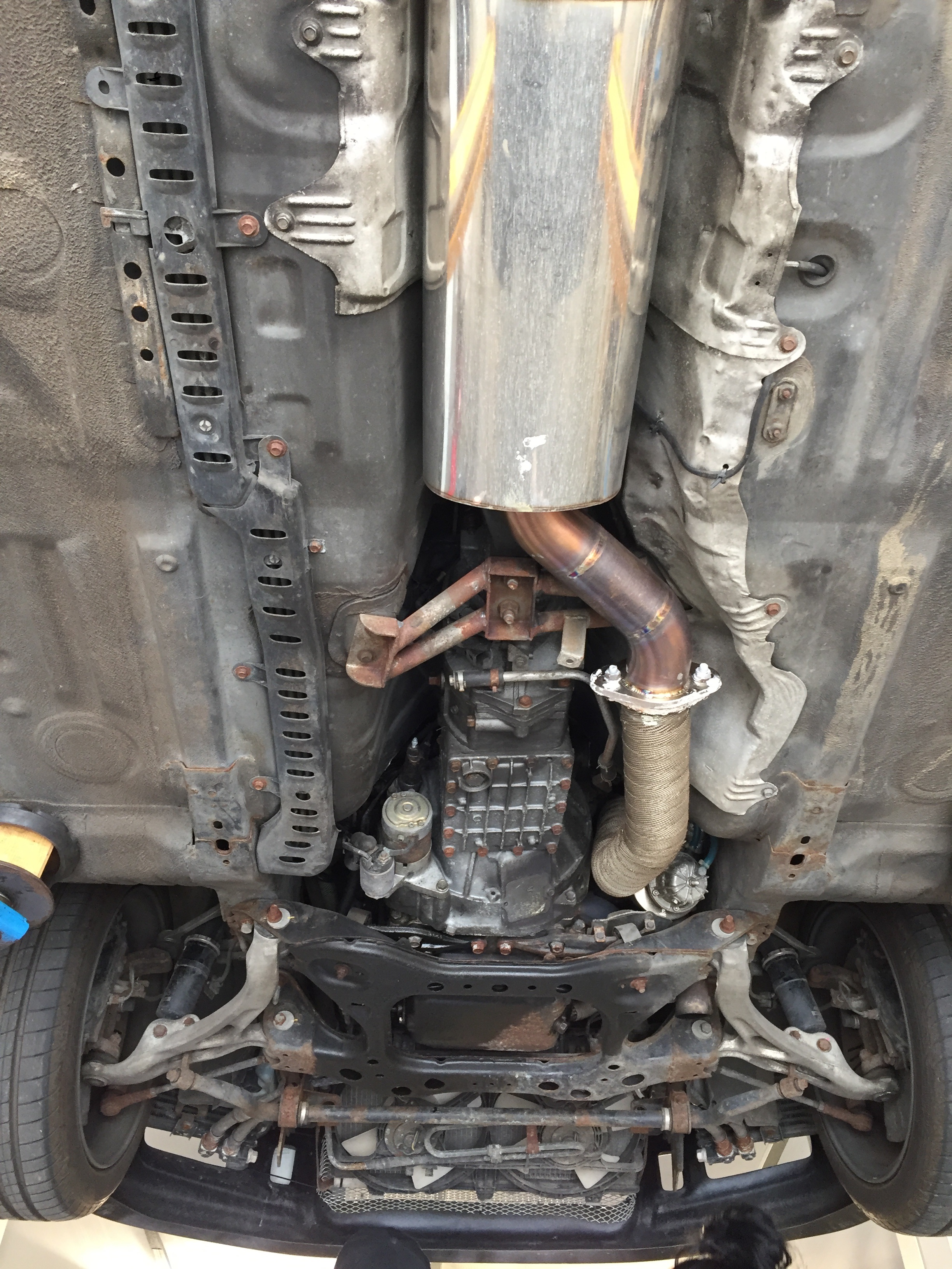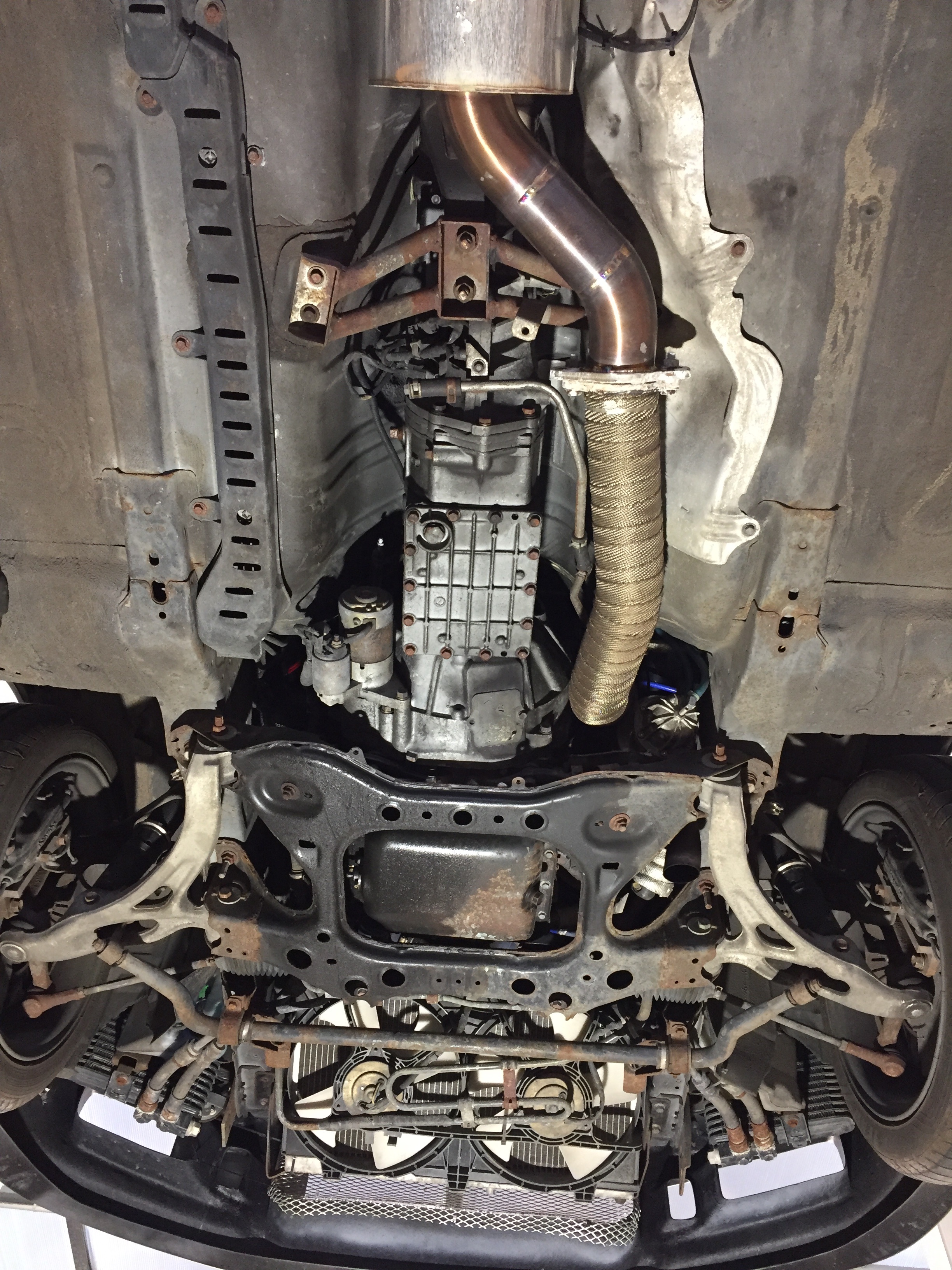 Dále došlo na úpravu výfuku. Nyní je celý výfuk na rychlo spojkách V- band. Důvodem byl hrozný vzhled původních, rozdílné příruby a složitý způsob demontáže. Nyní lze jednou maticí shodit celý výfuk, zpřístupnit svody, wastegate, servo. Dále došlo k navaření příruby na čidlo na měření AFR. Nyní je možnost ladit a kontrolovat směs.
