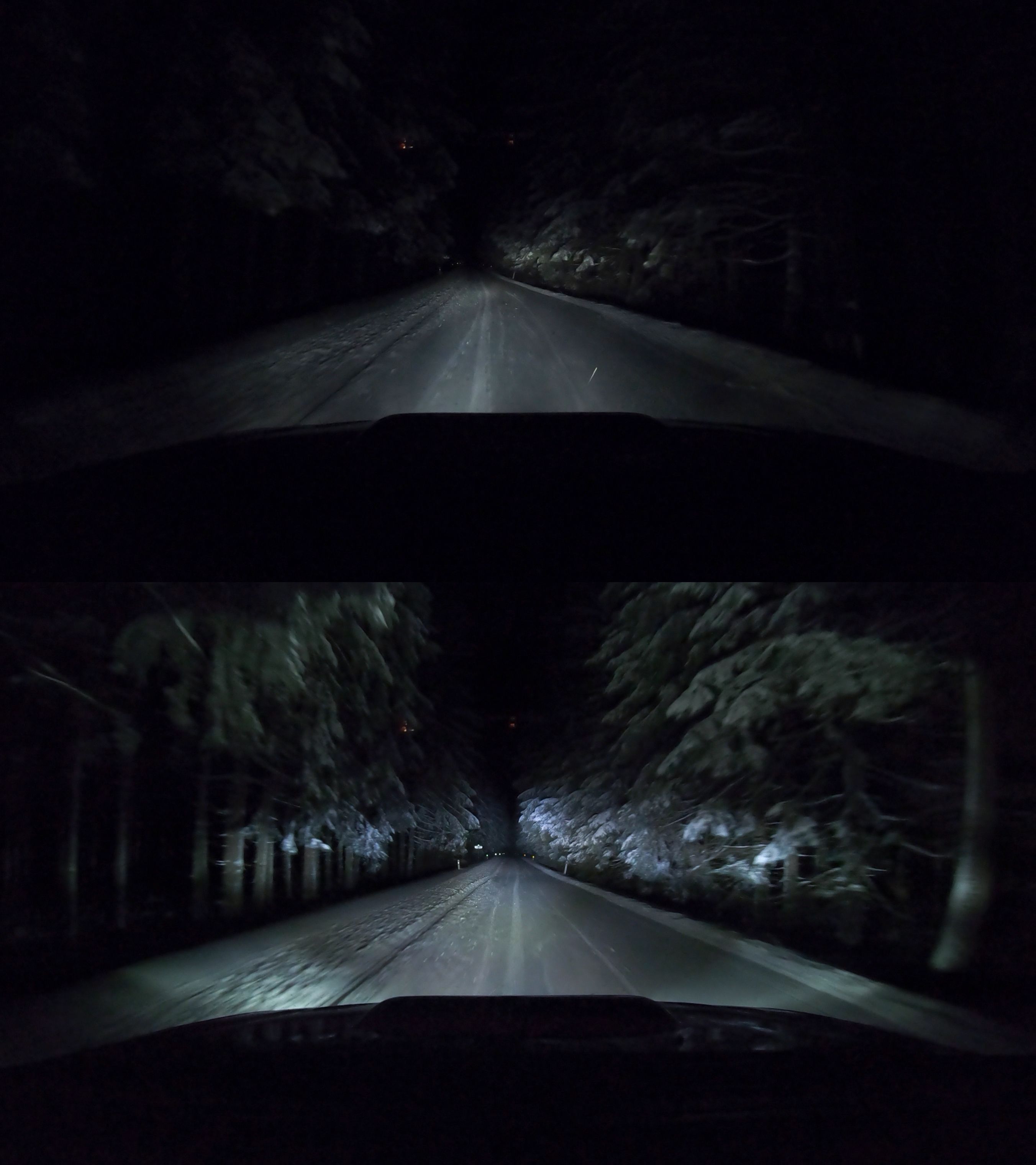 Bohužel foto se starou rampou nemám, ale řekněme že dosvit byl přibližně stejný jako u sériových dálkových ale rozptyl o hodně větší + daleko více světla, navíc jak je světlo zbarvené více do bíla až modra tak na sněhu paráda, na mokrém asfaltu už nic moc. Každopádně první pokus s rampou byl v pohodě, především za ty peníze, vyšla cca na 700,- z Ali, za pokus to stálo, ale myslím že vhodná spíše na expedice nebo něco pomalejšího, chtěl jsem především větší dosvit do dálky takže jsem cca 14 dní zpět namontoval rampu od Osramu FX500, cena necelé 4 tisíce, takže stále fajn například oproti Lazeru, kde obdobná rampa vyjde na minimálně 8-9 tisic. Takže super kompromis, no a výsledek, dosvit minimálně 2x tolik co dálkové a světla chvílemi až moc :lol: . Přiložené porovnání dálkové vs. dálkové+rampa, stejné iso, světelnost nikterak neupravované, v reálu bych řekl že rozdíl ještě znatelnější. Takže za mě bomba a mohu vřele doporučit, nic lepšího za ty peníze se zřejmě nesežene.