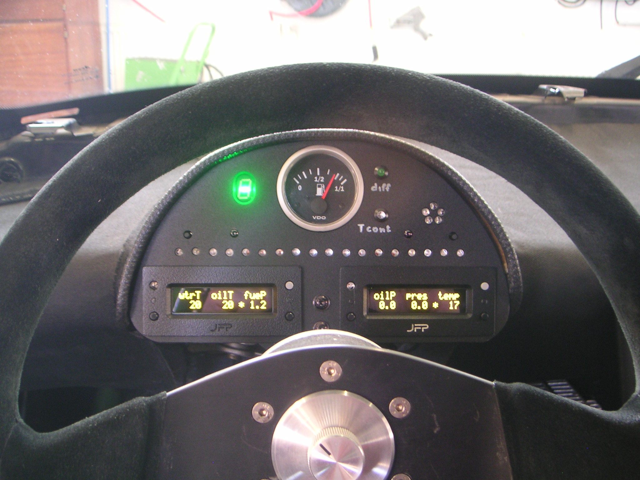 Vlevo hore je kvaltoměr z motocyklu, uprostřed starodávné palivo (ten se mi nechtělo měnit, jelikož měl přátelský vztah s nádrží), hvězda vpravo (Ljay) je ta zmíněná, tisíci lumenová facka volantovi pro spuštění reakce k urychlenému opuštění tratě. Dole v řadě shift light svítivosti pěti sluncí (taky LJay) - je dobře vidět i když se k němu člověk otočí zády. Samozřejmě dá se nastavit jak intenzita, tak blikání... Zobrazovače no cemment, můžu jen doporučit. Za sebe LJayovi děkuju, že si s vývojem a výrobou dal tu práci přesto, že to nemůže být moc rentabilní.