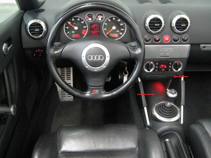 Goldies_mr2: Ahoj, s tímhle bohužel nemám zkušenost, ale co sem koukal na fotky interieru, tak mně napadlo, jestli by nešel zabudovat do popelníku, nebo přihrádky ve středový konzoli pod ním (viz. šipky). Budík má díky OLED displeji opravdu dobrý pozorovací úhly, takže na nej uvidíš i když bude ležet.
