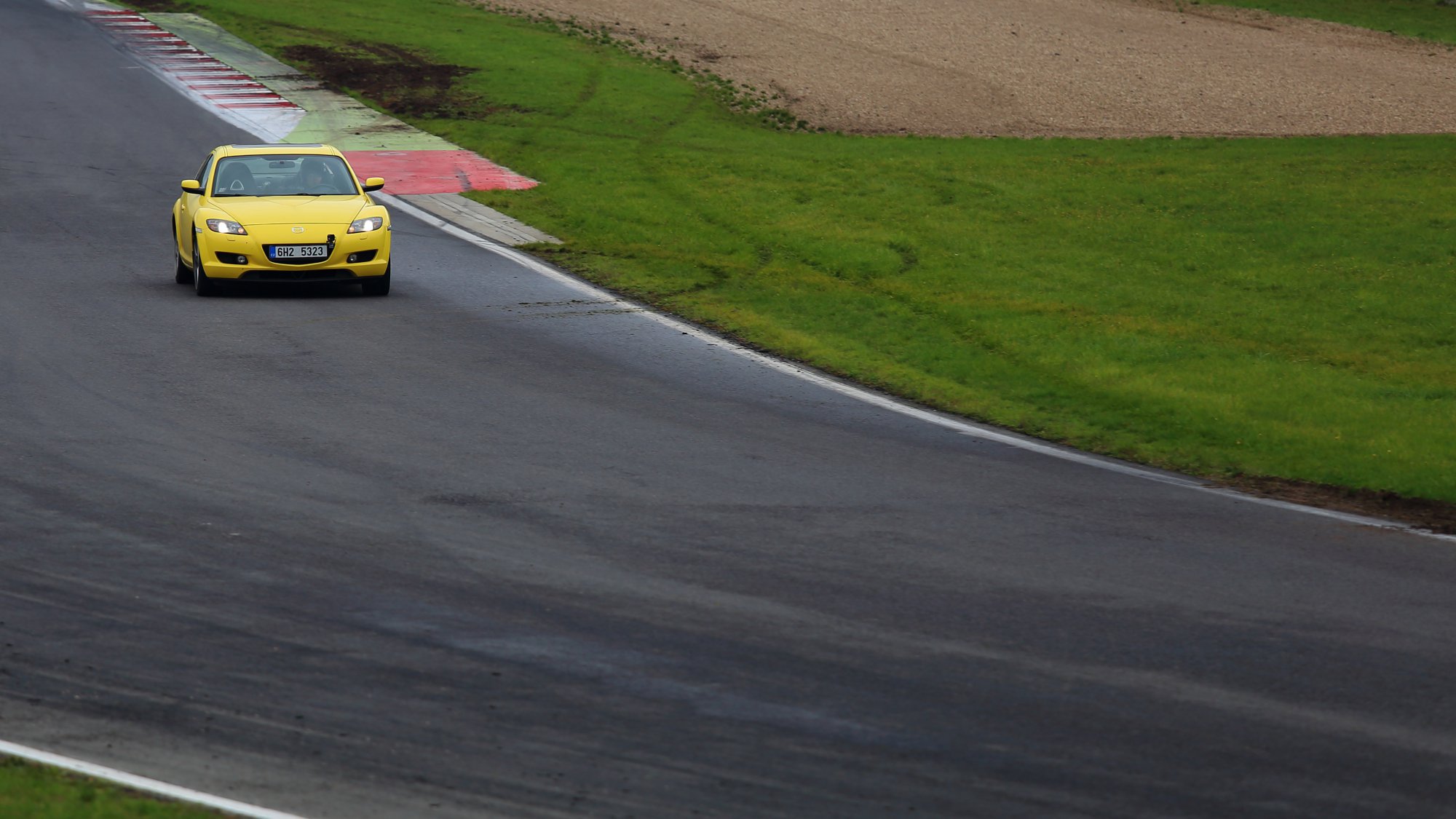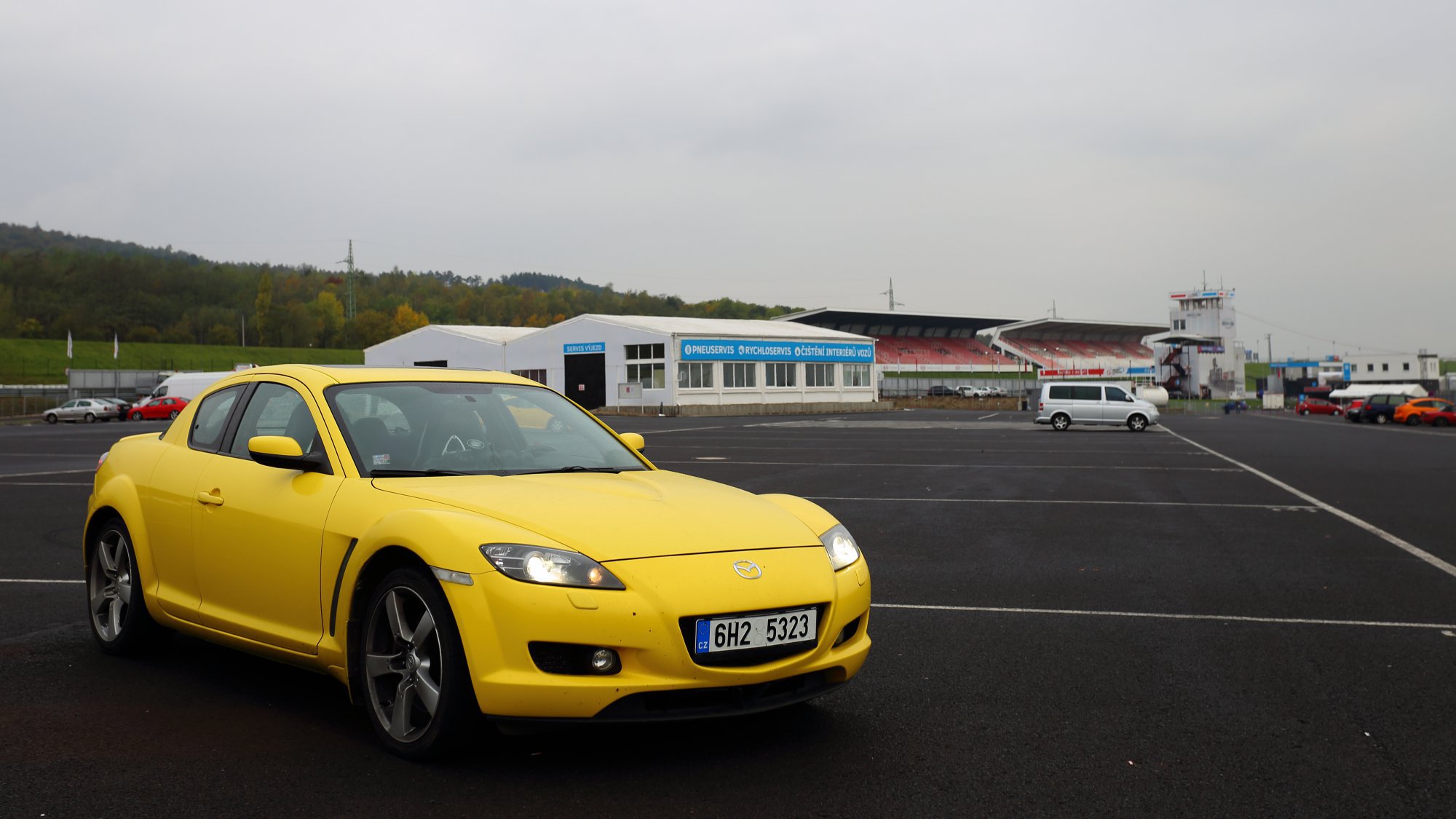 Sériová RX8 s nějakýma běznýma deskama a starýma slickama Matador se směsí D15 (235/640 R18), stock podvozek, stock odklony