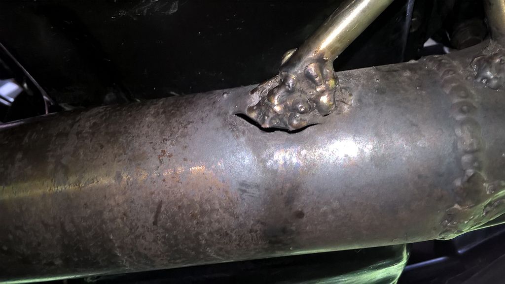 O víkendu sem měl trochu peška a při odbočování z hlavní silnice sem downpipou trefil bouli v asfaltu, tak blbě že se dost silně prohlo spodní koleno a utrhnul se držák. Takže sem tu prohlou část musel uříznout a navařit znovu.