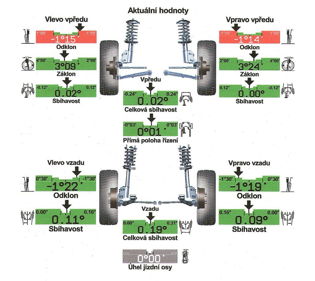 Po změně odklonů sem s tím byl na geo, kvůli seřízení sbíhavosti. Musel sem do jinýho servisu než jezdím běžně, protože měli zavřeno a mechanik si při seřizování nezaaretoval volant a ten je samozřejmně při jízdě rovně nepatrně natočený doprava. Je to jen o malinko, ale štve mně to, tak to zkusím poladit až bude čas.