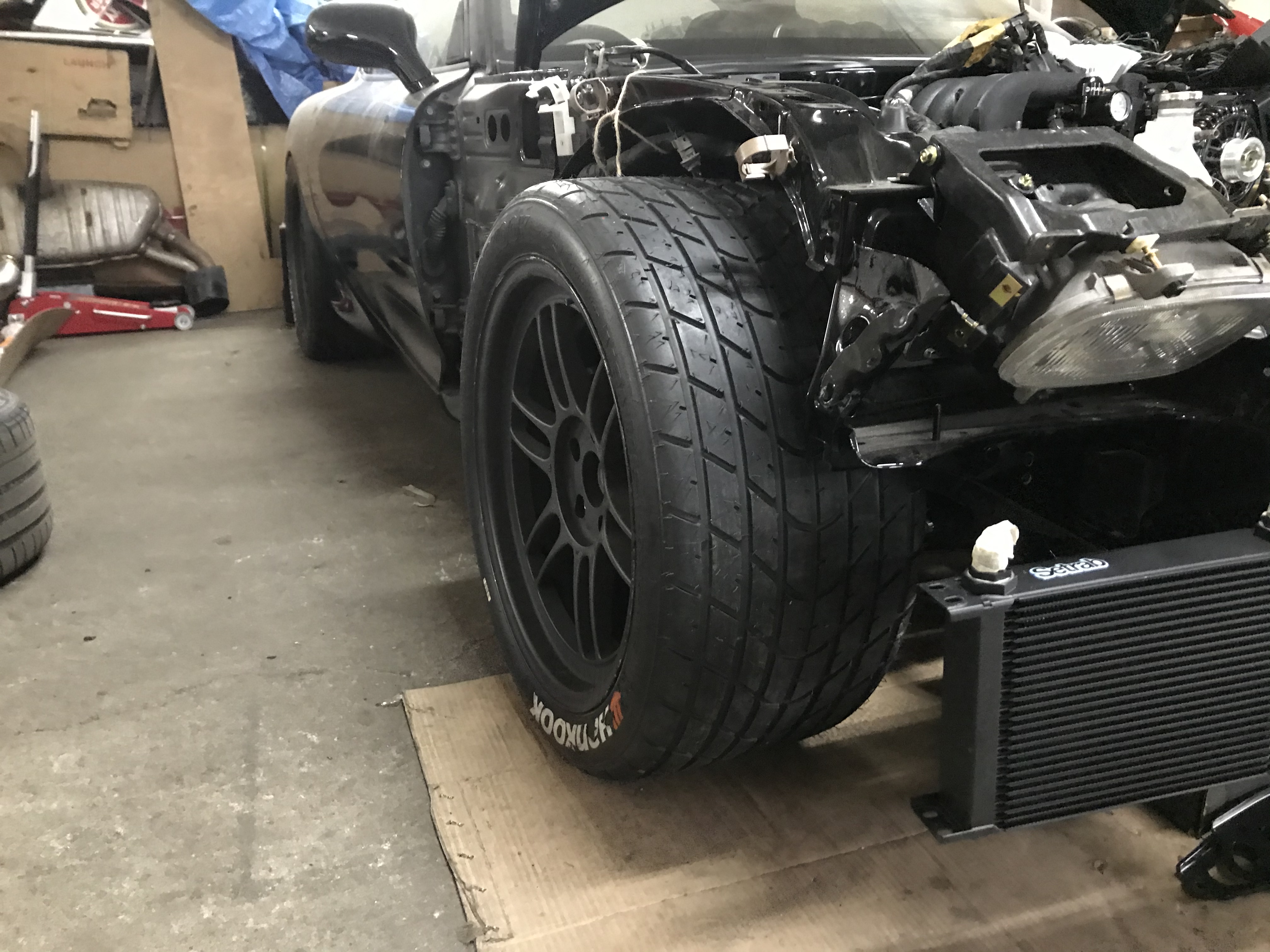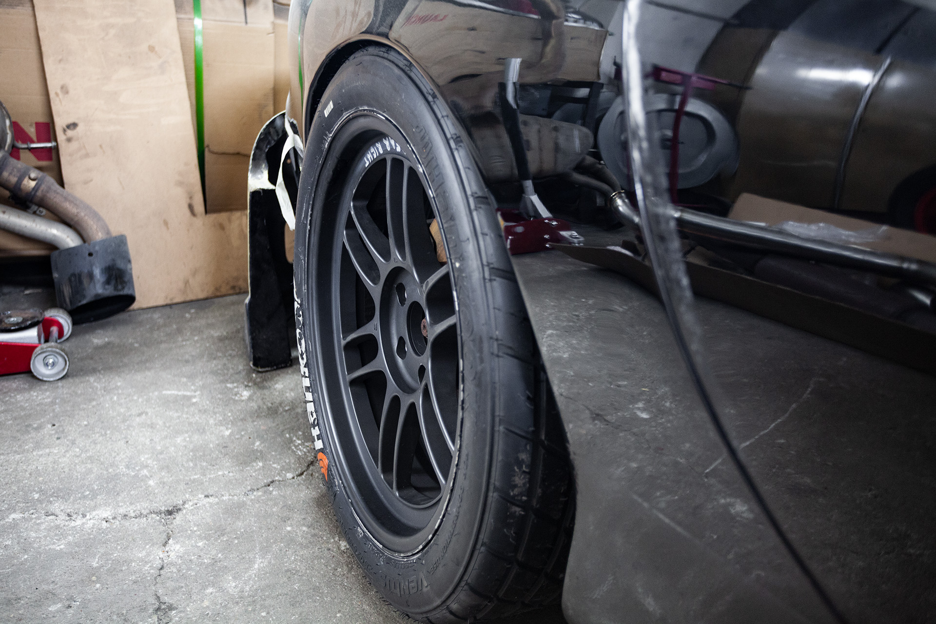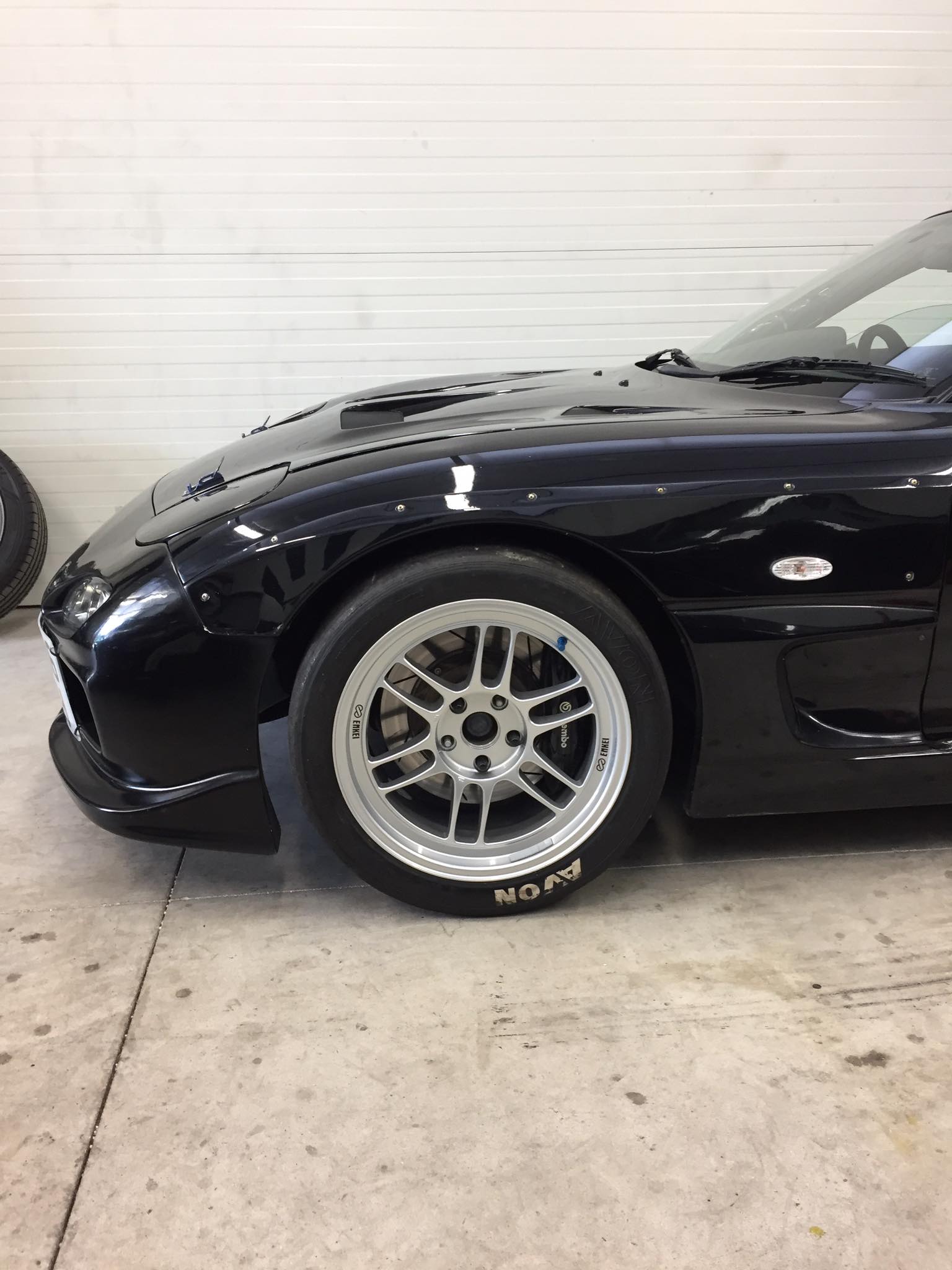 Zde další dílek, koupil jsem primární slickovou sadu kol...Enkei RPF1. Brzdič se vejde jen tak tak. Až přiijde body kit pak se ještě musí upravit podložka. Nyní jsou kola dost venku ve předu. Zadek věřím že bude ok s widebody.