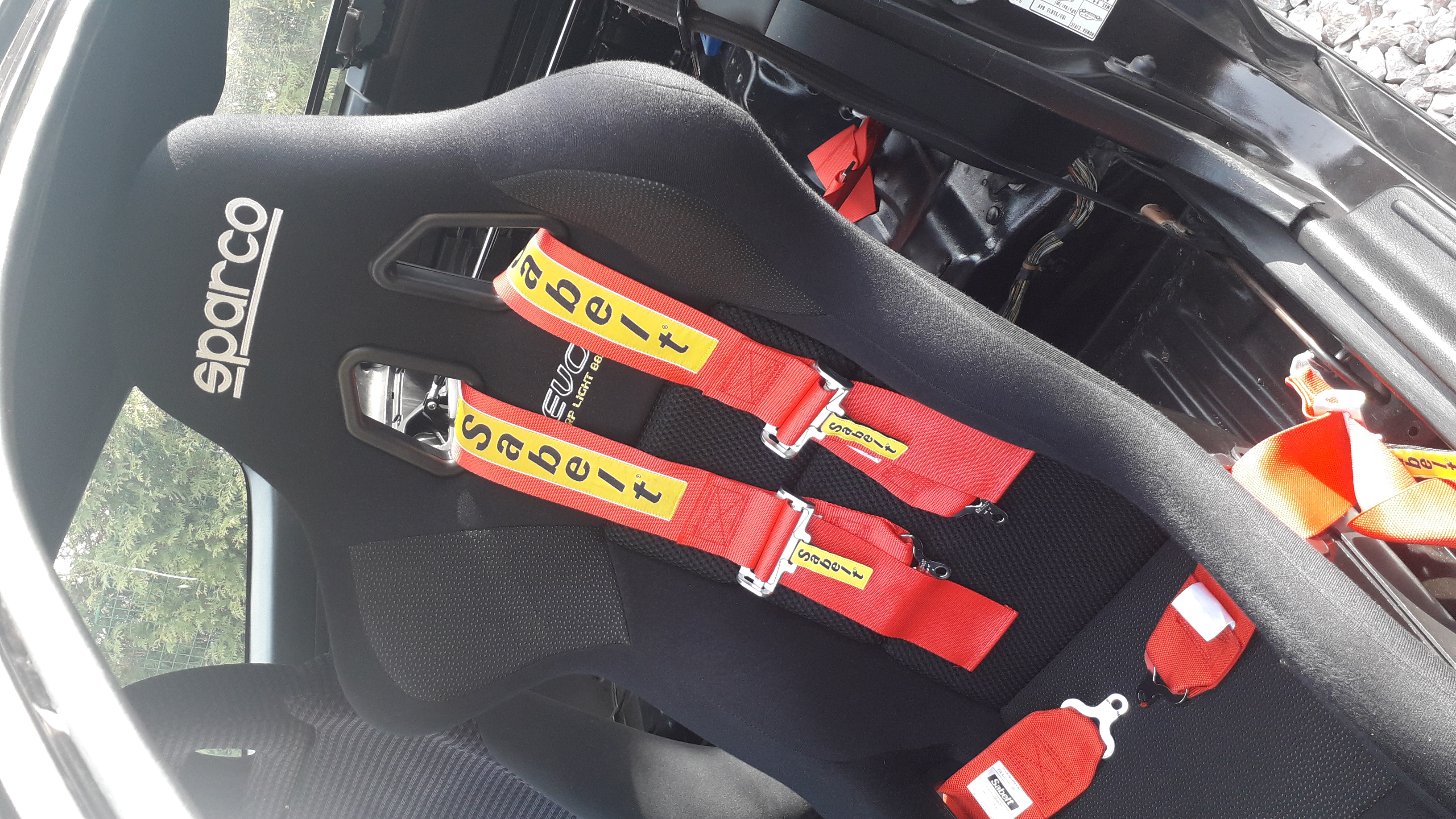 Vyházený interiér, OMP odsazený volant, "Bride" sedačky + SABELT 6 bod. pásy u řidiče, Takata 4. bodobé pásy u spolujezdce, zadní rozpěry C sloupku, hasičák pro pocit, short shift + prodloužení řadící páky, sportovní pedály "Mugen".