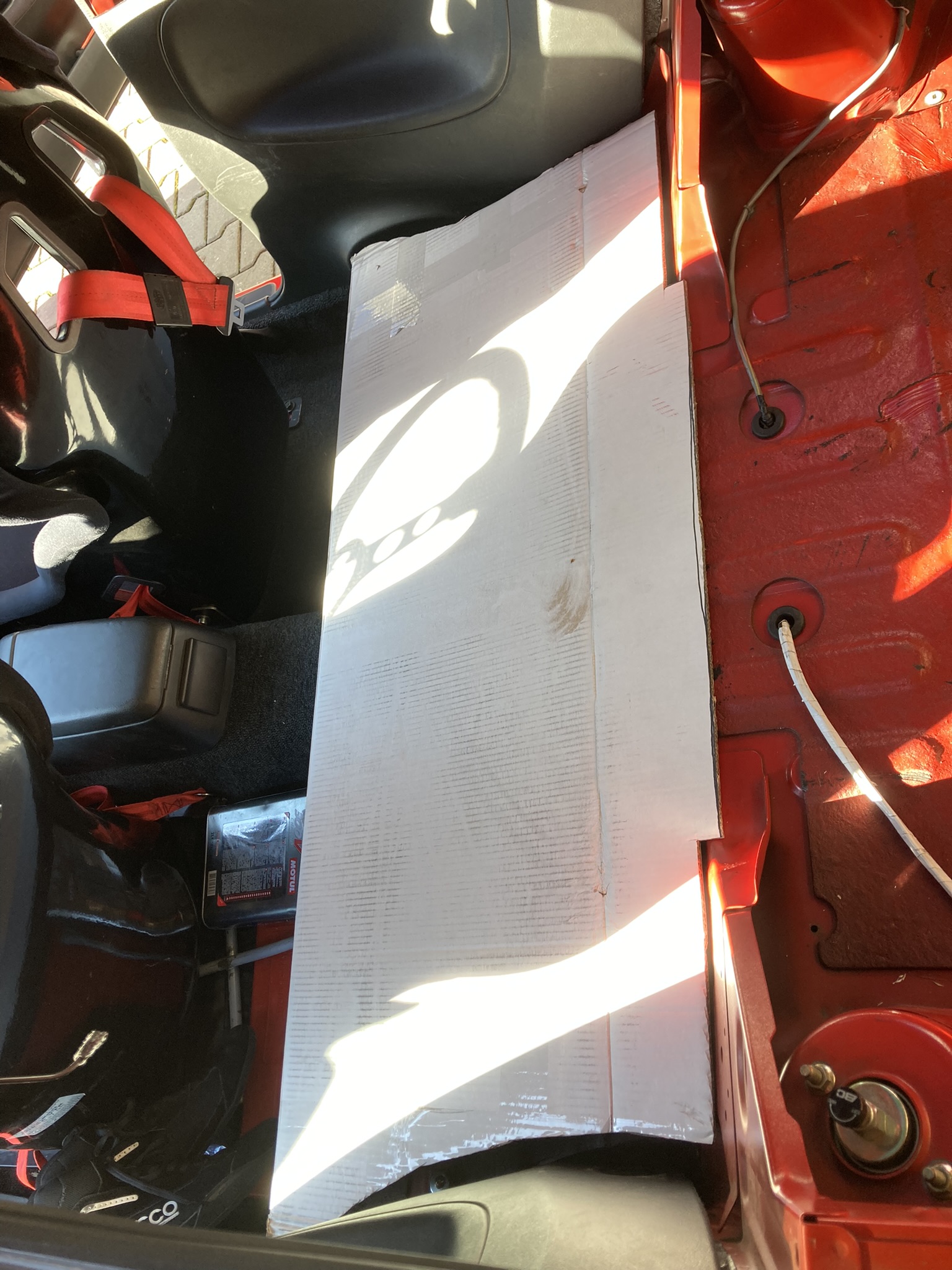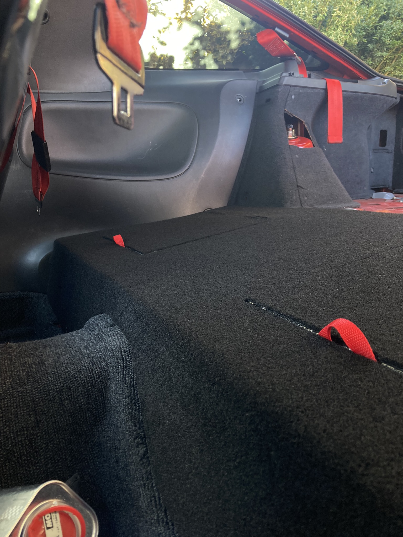 Tak i dvoukilo se mi podařilo dodělat. Boxy místo sedaček, vzpěra pro pevnost a ukotvení pásů, vrácení interiéru, dodělání podlahy v kufru, posunutí sedačky řidiče dozadu. Vzpěra nakonec dostala ještě dvě "táhla", jelikož se obávám, že by se při nehodě mohly urvat šrouby od podvozku. Takto by to hrozit nemělo. Asi je to zbytečné ale jsem takto klidnější.