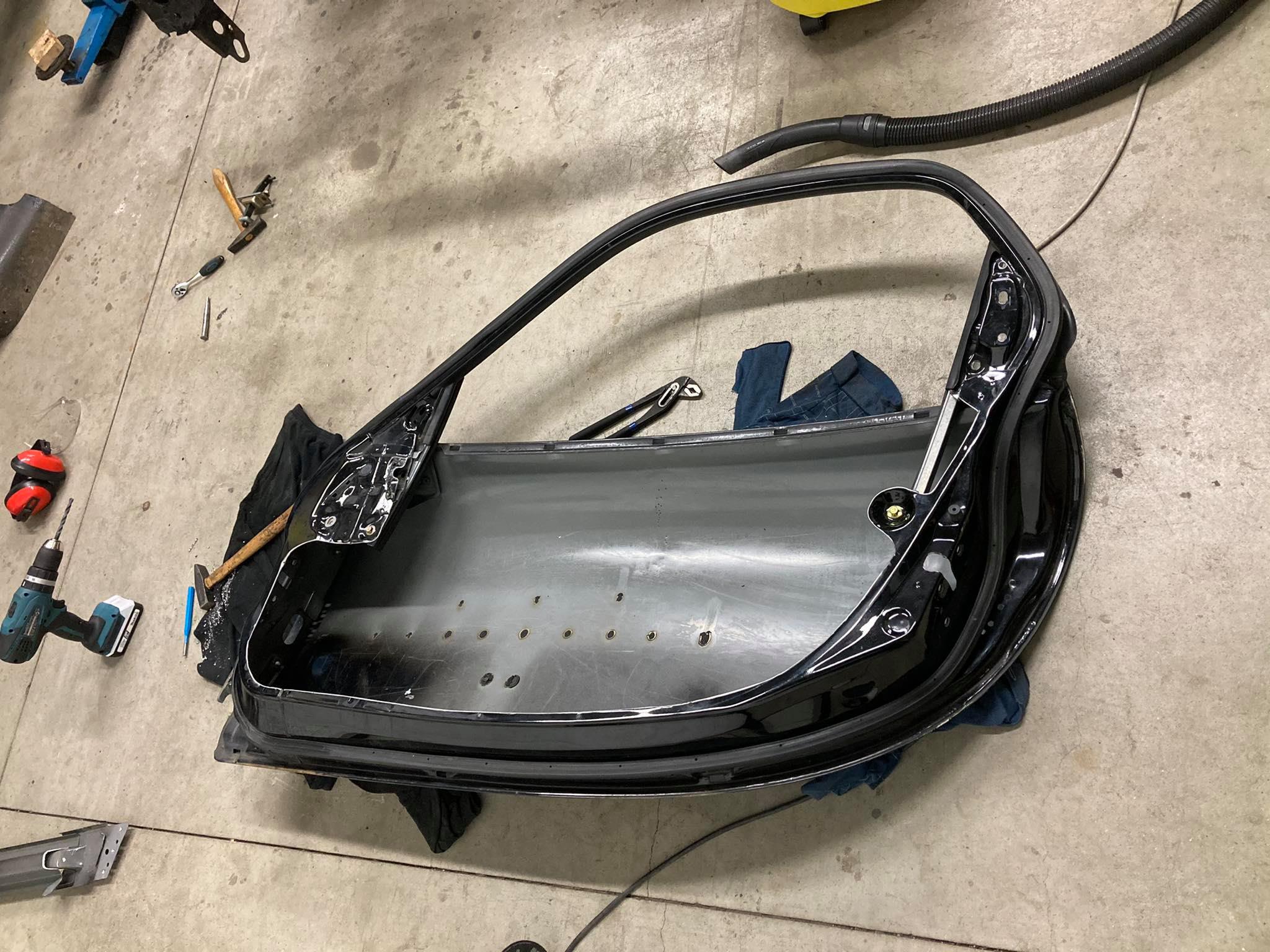 Jinak auto bylo již kompletně odstrojeno a při té příležitosti se vyřešil otazník číslo tři a to byly dveře. Full karbon VS série odlehčená. Být to jakékoli jiné dveře volba je jednoznačné fullcarbon protože odhadovaná váha nastrojených dveří byla cca kolem 5-7kg což oproti 28 kg za jedny dveře je fajn úspora váhy. Vše se mi líbilo do té doby než sem začal sundavat těsnící gumy dveří a zjistil jsem, že dveře mají takové množství zákoutí a profilování kvůli gumám, že sem prostě nedokázal vymyslet způsob jak bych to zaformoval. Jasně řešení by se vymyslelo časem ale reálná výroba by byl na ještě dýl než přístrojovka a nejistý výsledek. Bouchalo by to o kastli? Těsnilo by to? Doléhalo by to? Lícovalo by to s kastlí?